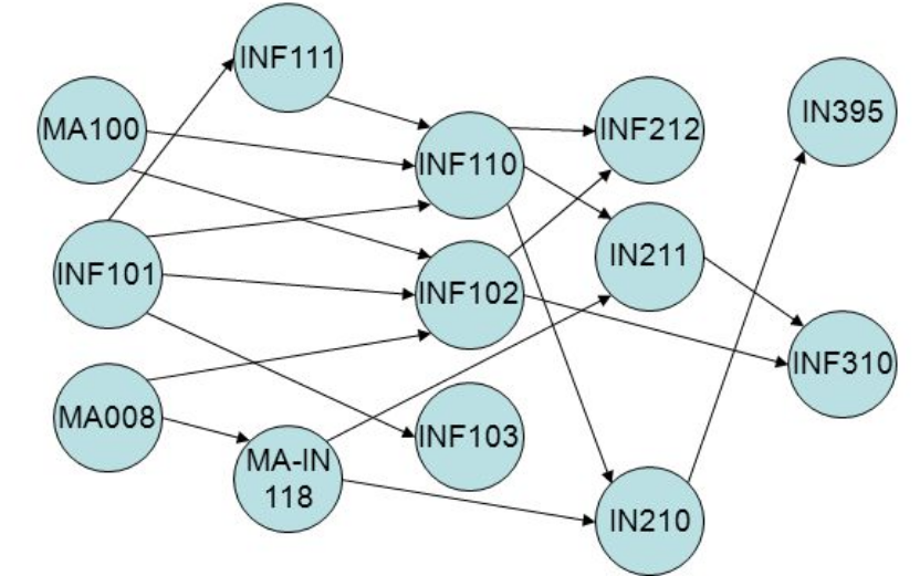 F.eks. ser vi fra grafen at emnet INF110 (som har tre inngående kanter) krever at man har fullført emnene MA100, INF101 og INF111. Emnet IN210 krever bl.a. MA-IN118, som igjen krever fullført MA008.