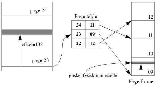 I denne figuren brukes den samme virtuelle minneadressen [23,132] som ble vist i figuren i avsnitt 1.2.1. I pagetabellens indeks 23, som er nummeret på den virtuelle pagen, finner vi verdien 9. Dette er nummeret til en page frame i det fysiske minnet, der dataene i virtuell page 23 faktisk ligger lagret. Den riktige minnecellen i RAM adresseres da ved å legge til offset (132) til page frame adressen. Virtuell og fysisk minnecelle som svarer til hverandre er skravert på figuren. 1.3 Page fault og page replacementFordi det samlede virtuelle minnet kan være større enn kapasiteten til RAM, vil innholdet i en page frame enten ligge i RAM eller være swappet ut på disk. Dette håndteres av Memory Manager i OS, som lagrer og vedlikeholder diskadressene til page frames som ikke er i RAM. Hvis en prosess adresserer en virtuell page som ikke ligger i RAM, får vi et avbrudd som kalles for en page fault. Memory Manager må da sørge for at den riktige page frame leses fra disk og inn i RAM, før prosessen kan fortsette: