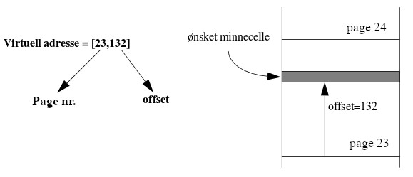 1 Virtuelt minne og algoritmer for page replacementDatamaskinene våre kjører mange prosesser som har behov for mye minne. Spesielt multimedia-applikasjoner kan kreve flere GB med RAM. Noen av disse prosessene er i seg selv for store til å passe inn i det tilgjengelige minnet. Det samlede minnebehovet til alle prosesser på systemet kan ofte være (mye) større enn det fysiske minnet som er tilgjengelig i user space. Vi trenger derfor å kunne kjøre programmer som bare har deler av minnet sitt liggende i RAM. Løsninger der hver prosess får ett stort, sammenhengende fysisk minneområde, vil ikke fungere i praksis. Med mange minnekrevende prosesser blir det etter hvert umulig å finne ledige "hull" i minnet som er store nok. Det tar også alt for lang tid å lese/skrive store minneområder til/fra disk når minnet er fullt. Det er derfor utviklet løsninger som deler opp minnet for en prosess i mindre deler, slik at noen deler kan ligge i RAM og andre midlertidig på disk: